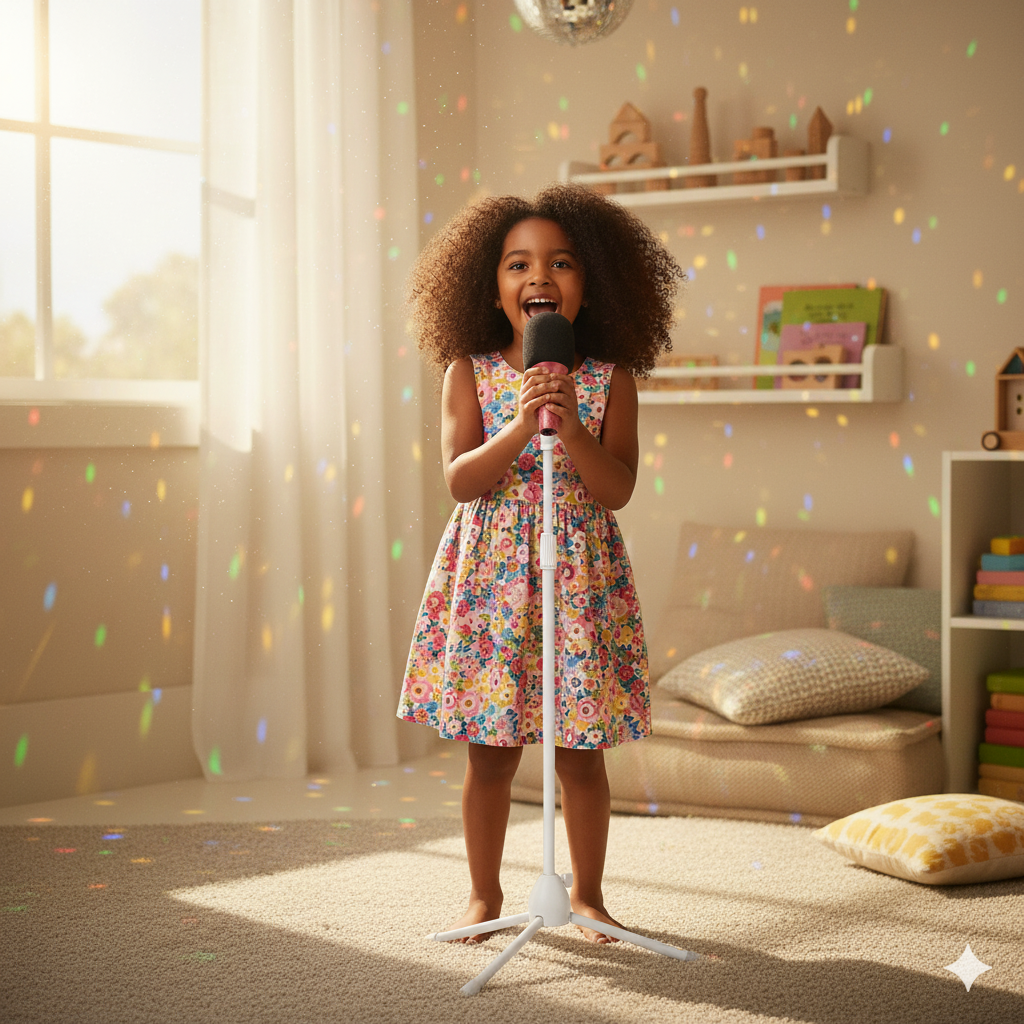 Mit einer einstellbaren Höhe von 70 bis 145 cm wächst er mit dem kleinen Superstar mit. Die dreibeinige Basis hält den Ständer stabil, selbst während der energiegeladensten Tanzbewegungen.