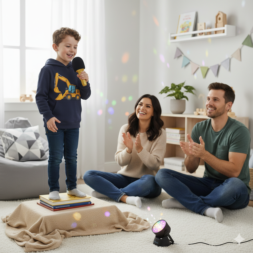 Dieses kabellose Mikrofon im tollen Glitzer-Look, ist vollgepackt mit lustigen Funktionen, darunter magische Soundeffekte, einstellbarer Hall und originelle Klangunterdrückung.